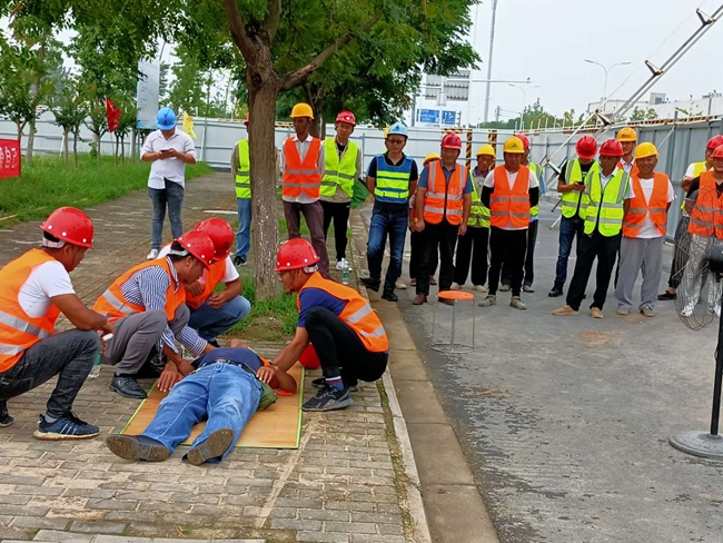 此次演練是模擬工人在戶外作業(yè)時發(fā)生中暑后的現(xiàn)象以及如何進行急救的。演練現(xiàn)場,演練示范人員按照應(yīng)急預(yù)案對“中暑”的員工進行緊急施救,首先發(fā)現(xiàn)中暑人員后將其迅速轉(zhuǎn)移到陰涼通風的地方,移動、冷敷、擦浴、降溫、補水......各項救援措施緊張有序。整個演練過程歷時30多分鐘,中暑人員在急救小組的緊密合作下,及時得到救治。演練過程中,市政工程部全體人員和各在建工地相關(guān)人員全程參與觀摩。