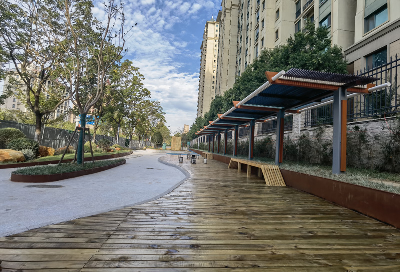 口袋公園不僅要好看,更要實(shí)用。青海湖西路微公園項(xiàng)目是園區(qū)2022年為民辦實(shí)事工程之一,是在青海湖西路外側(cè)15米綠化帶內(nèi)進(jìn)行升級改造,改造之初,曾是封閉得綠化帶,改造后增加了成人及兒童健身游樂設(shè)施,邊上配套了公共廁所,居民出小區(qū)就有休閑游憩得小場所,實(shí)現(xiàn)居民出門5-10分鐘即有一片綠色共享空間。