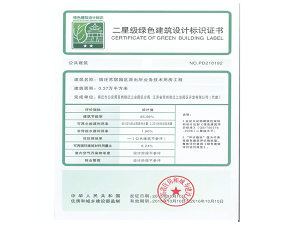 近日,由開發(fā)公司代建的蘇宿園區(qū)派出所業(yè)務(wù)技術(shù)用房工程,順利通過國家二星級綠色建筑設(shè)計標(biāo)識認證。